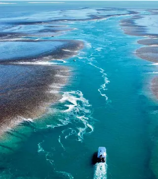 - Day 4Doubtful Bay & Montgomery ReefFriday, Aug 7, 2026The sites we will visit in Doubtful Bay and Montgomery Reef will be determined by the power of the Kimberley ocean tides. Regardless of where we go and when, we are sure to see spectacular scenery, with towering sandstone cliffs and the natural wonder of the world’s largest inshore algal reef. Activities may include sunrise Xplorer cruises and Zodiac rides to get a closer look at the wonders of this unique part of our planet. Montgomery Reef is a biologically diverse area covering over 116 sq mi (300 sq km) and was named by Phillip Parker King. Twice daily, as the sea recedes in mammoth 36 ft (11m) tides, Montgomery Reef rises from the Indian Ocean in a cascade of rushing water revealing a flat-topped reef pockmarked with rock pools and rivulets. As the reef emerges, you’ll get up close in Xplorer and Zodiac inflatable tenders to witness the spectacle as the Expedition Team share their knowledge on the formation of the reef and the myriad wildlife. Opportunistic birds and sea turtles take advantage of the emerging reef, feeding on marine life left exposed in rock pools. The ocean is awash in a swirl of eddies and whirlpools as the moon’s gravitational force takes hold. Then, a few hours later the entire water-borne drama is reversed as the tide comes in and Montgomery Reef disappears below sea level.